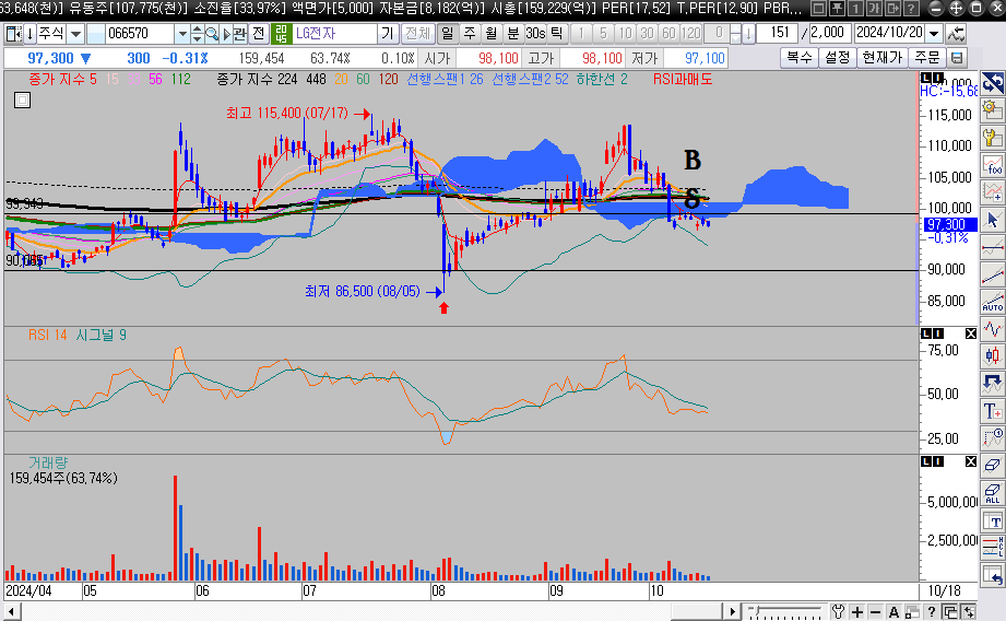 LG전자 ( 움직였던폭&상승눌림 / ▼0.9% / 1d(10.15-15) / 98,300 )
